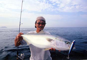 最初のポイントは瀬のトップが12m程までかけ上がった所だった。ミヨシ側からポイントに入っていたのでミヨシ側にはバイトがあるものの、トモで釣っていた私のところまでなかなかチャンスがこない。辛抱してヨタヨタと左右にゆっくりダートさせているとK.I.POPが水面から消し込まれた。