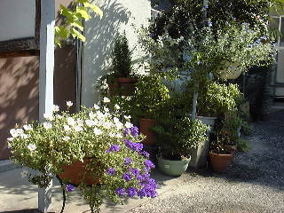 出張から帰ってきて、花は無事でした。でも8月に4日ぐらい家をあけたらどうなっていただろうと思うと不安です。あの程度の灌水装置で持つのだろうか。以前、8月に4日出張で家をあけた時は、吊り鉢類は裏に、大事なものは家にいれ、地植えの物は母に水をやりに来てもらいました。