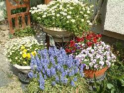 ムスカリとノースポールとビオラ チューリップとビオラ。ビオラは勝手に生えたもの。 ガボタという名前のチューリップ。色が渋い。