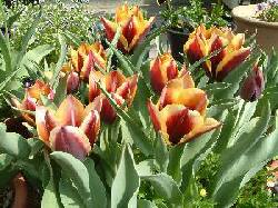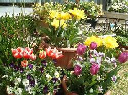 やっとチューリップの一番花が咲きました。紫のパープルフラッグと赤白のリンファダーマーク、白緑のスプリンググリーンです。今年はチューリップの間から出たビオラの芽をつまずにおいたので、チューリップが咲く前から鉢の中がかなりにぎやかです。でも、これから気合いれて肥やしをやらなければ、ビオラが全部栄養を吸ってチューリップの球根にはまわってこないでしょう。 2004年の同じ日にも写真をとっていたので比べてビックリ。昨年は同時期にチューリップ満開です。3月末に冷えたのが効いたのでしょう。