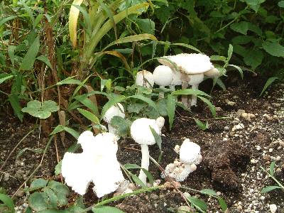 6月はカラ梅雨だったのに7月に入って集中豪雨の日ばかりです。しばらく庭に出なかったら、庭にキノコが生えていました。それも大漁節。シロハツという食用キノコに似ていますが、気持ち悪いのですぐ撤去しました。毎日雨で草がとれないので、見てのとおり花壇が雑草王国です。