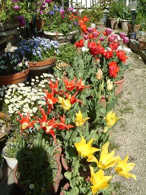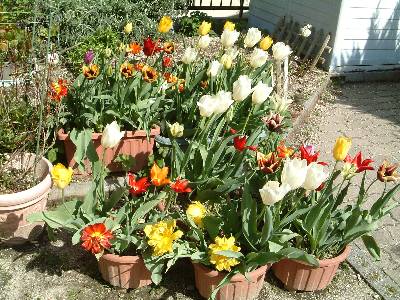 我が家の庭がチューリップ祭状態になりました。狭い庭に約150本のチューリップが所狭しと咲いています。 左のチューリップは主に新球根、上のチューリップは昨年の残り球根です。古球根では、白い花が増えて来ました。歩留りのいい球根なのでしょうか。新球根は1鉢に5球ずつ同じ種類を植えていますが、古球根は特に咲きそうなのを丸鉢に5球ずつ、なんとか咲きそうなのを角プランターに植えています。咲きそうもない球根で捨てるのはもったいないクラスは、大きなプランターにドサっとうつして土をかけておきます。それでも咲くつもりのあるものは咲きます。
