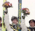 全部の競技を見ていたわけではないので、よくはわからないんですが、右の花は滅多にテレビに映りませんでした。確かモーグルの里谷多英選手と、ジャンプの原田雅彦選手(団体の時、写真)が玉のついたデザインのをもらったような気がするのですが、後はみんな輪のデザイン。休みの日は朝から晩まで、平日は帰ってからすぐ、とオリンピックのテレビを結構見まくっていた私ですが、玉のデザインを見たのは2回だけでした。
