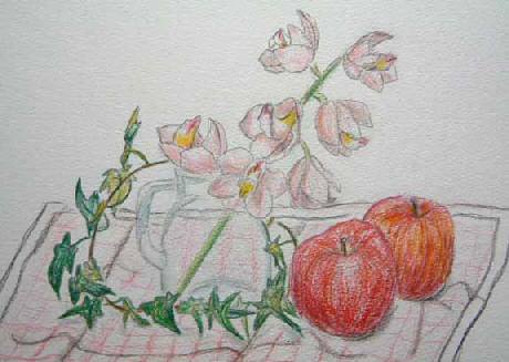 毎年、職場でやっている職員美術展。私は陶芸愛好会のメンバーとして作品を出品してきた。しかし、昨年困ってしまった。一昨年に一回も参加できなかったので、陶芸作品が何もない。何回か陶芸愛好会の活動はあったのだが、ミュージカルの稽古との兼ね合いで行けなかった。うちの押し入れには焼いてもらうだけになっている作品があるのだが、愛好会で預かっている半製品を焼く日にも持って行けなかったので、茶碗の形をして土しかない。何とかしなきゃ、と前の日に書いた絵がこれ。出品するものが何もないのは早くからわかっていたので、昨年は出品を「絵画」で登録しておいた。ギリギリになるまであまり絵を書きたい気分にならなくて、おまけに額もなくて、搬入日の夕方に額を買いに行って会場に置いてくる始末。今年もかなりそれに近い状況。昨年は夏休みに陶芸はあったのだが、参加できず。相変わらずうちの押し入れには焼くだけになっている土が入っている。おまけにひょんな事でケチがついて、美術展の日程がつかめなかったし、絵も書くほど時間がないので今年は出品をやめようかと思っていた。そして搬入日の2〜3日前に、3年位前に作った未発表の切り絵が職場に置いてあったのを発見。しかし額がない。(出品は額装または表装が条件。)しかたなく「切り絵は持って帰って家に飾ろう」と思い、車に積んだ。そして仕事の帰りに取引先にお届け物をして、額屋の前を通りかかった。そこでひらめいた。「額を買おう!。」私は額屋に飛び込んで、作品を見せて適当な額を選んでもらった。それから車の中で切り絵を額に入れて会場に届けた。