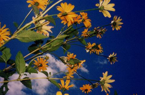 カメラをヒマワリの花の下に入れ、空を撮ってみました。真昼なのに空が黒いほど青い。エジプトやギリシャの写真の空のように、紺碧な空に撮れました。