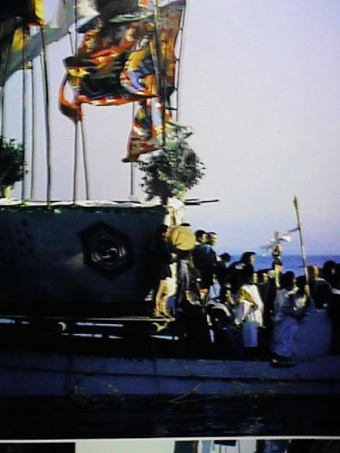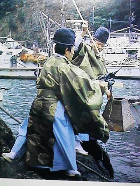 熊野諸手船の遺型であると伝えられ、天鳥船、天鳩船とも呼ばれる。左右の舷に四人、計八人が一本宛の櫂を両手に持って前向きに座って漕ぎ、艫で一人が大きな櫂の形をした梶によって操舵する。 |