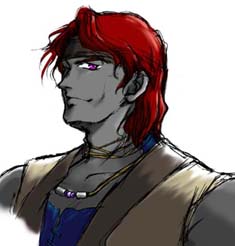 北方の国境に近い町の生まれ。父親は町でも尊敬を集めていた名門の幻術師。母は既に滅びた南方の小国生まれの旅の踊子だった。黒い肌と赤い髪は母譲り。紫の瞳は父譲り。母親の違う10歳年上の兄がいる。 超優秀な幻術師だった兄へのコンプレックスと、「ある事件」がきっかけで、15の歳に家出。20歳までは母親の一族と共に旅芸人の生活(ナイフ投げ、踊りなどは、この頃覚えた)をしていたが、その後一族とも別れ、放浪の果てに紗羅の町に辿り着く。 紗羅の町で最初に出会った女性弥勒とは、一目惚れ状態(?)でいまや公認カップル。プロポーズもしたし、子供も出来ました…が、結婚式はしたのか?(笑) パートナーのベックマンとは、お互いプライバシーには立ち入らないという暗黙の了解がある大人な関係(?)だが、実は精神的にはかなり依存している(笑) 家出した当初はかなり世を拗ねていたが、15年の放浪の間に、その性格も360度曲がり切り、正位置に戻る。モットーは「有言強行」元来押しの強い男だが、紗羅の町に来てからは、なぜか説教癖まで出来た模様。自分より弱い(と、判断した)相手には、とことん甘い(笑)困ってる相手をほっとけないという、おせっかいなおやじと化している…これも紗羅の町のおかげ…とは本人の弁。 |