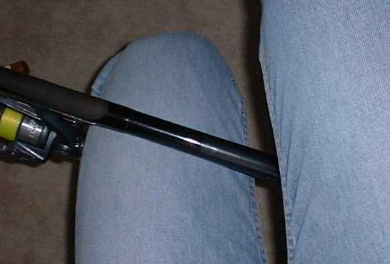 片方の足の上(当然膝より上)に竿のリールシートの下辺りを置いて、反対の膝の裏側で竿の下端を挟むのです。海に向かって斜めに座れば、竿先を海に突きだしたまま竿を足で保持することが可能になります。