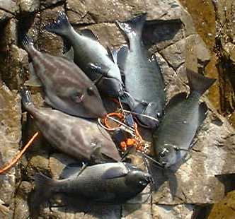 | 本日の釣果(2000.2.11) ウマヅラハゲ30cm級2枚 グレ23〜27cm5枚 (1枚リリース済み) 要するにボウズでした。 磯ベラ,草フグがメインの 餌取り。 R地磯はグレポイント? |