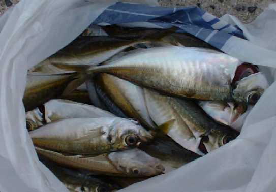本日の釣果(2000.06.04) アジ20cm級20〜30匹 キス同クラス2匹 メゴチ15〜20cm級5匹 今日は家族でゆっくりと 五目釣りです。 |
