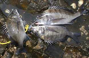 本日の釣果(2001.8.11) チヌ33,32,31cm 計3枚 深い・・・(同様隠せずの 徳山湾でした) |
